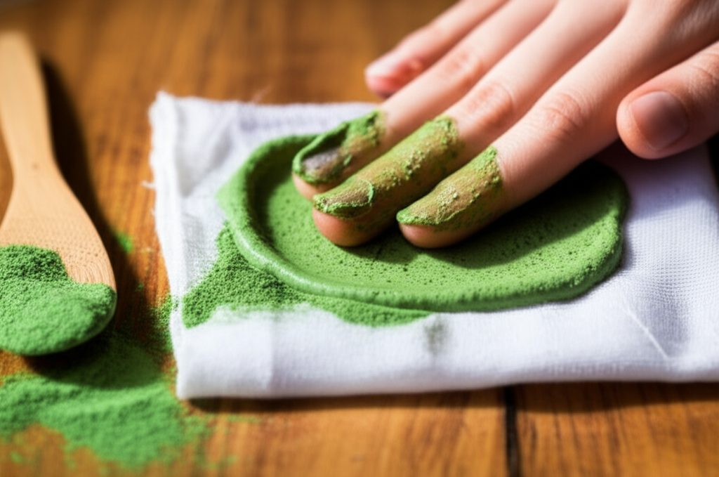 - Application : Étalez le cataplasme d’argile verte sur la zone affectée, en une couche d’environ 1 à 2 cm d’épaisseur.